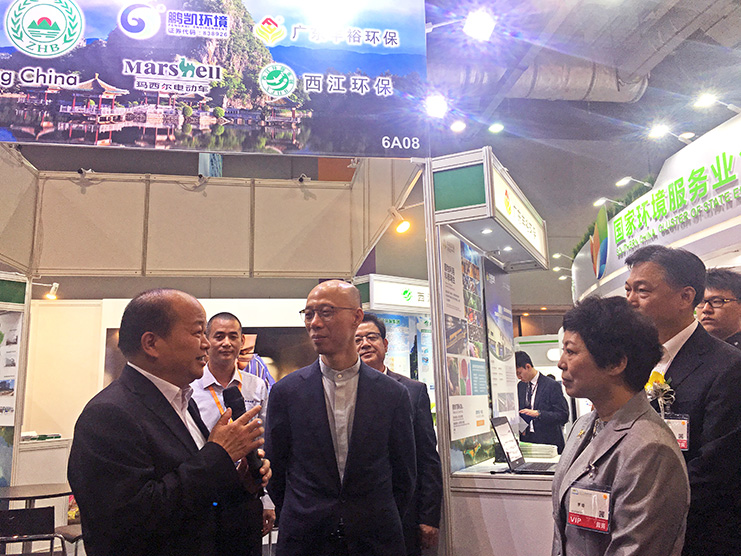 肇慶市江森源副市長現(xiàn)場向香港環(huán)境局黃錦星局長講解肇慶參展環(huán)保企業(yè)情況,重點介紹了我司農村生活污水處理創(chuàng)新工藝及技術。