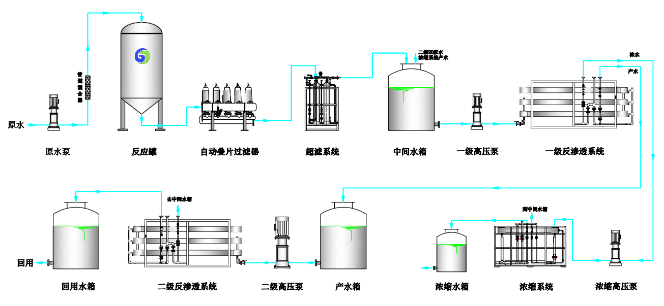 本廢水回用及零排放系統(tǒng)設(shè)計(jì)規(guī)模為10m3/h,其中處理后9m3/h回收作為客戶純水系統(tǒng)原水、經(jīng)濃縮后1m3/h的水,進(jìn)行MVR濃縮處理,實(shí)現(xiàn)零排放。本系統(tǒng)采用反應(yīng)罐、自動(dòng)疊片過濾器、超濾系統(tǒng)、反滲透系統(tǒng)等其他系統(tǒng)作為核心工藝組合,多級(jí)濃縮,結(jié)合各類監(jiān)測(cè)儀表、控制系統(tǒng),使產(chǎn)品水質(zhì)滿足車間回用要求、濃水進(jìn)一步濃縮處理,實(shí)現(xiàn)零排放。減少?gòu)U水排放量也減少工藝用水量,達(dá)到了“節(jié)能、降耗、減污、增效”目的,符合清潔生產(chǎn)理念。