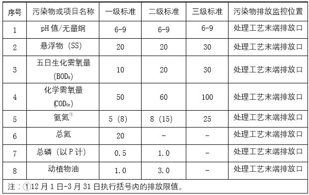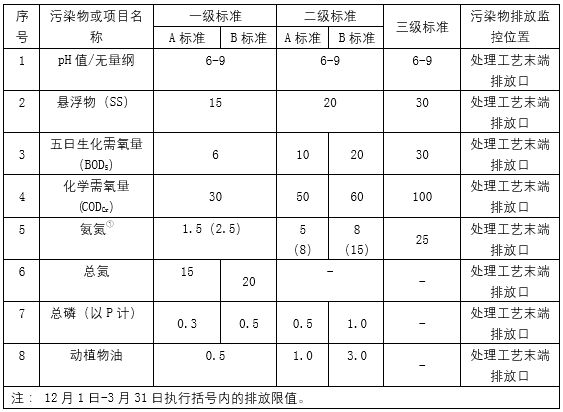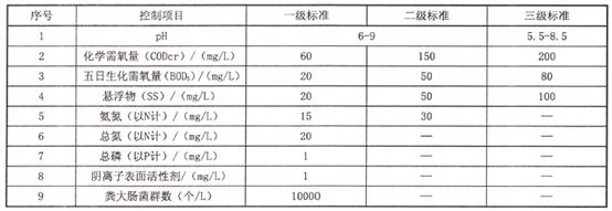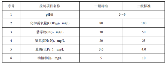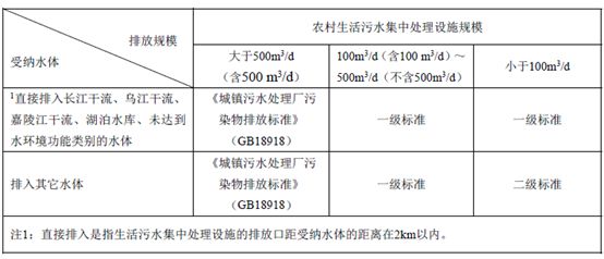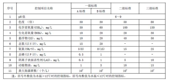 出水排入其它水體的處理設施執(zhí)行二級標準。其中,規(guī)模大于50m3/d(含)的處理設施執(zhí)行A標準,規(guī)模在50m3/d(不含)-5m3/d(含)的處理設施執(zhí)行B標準。