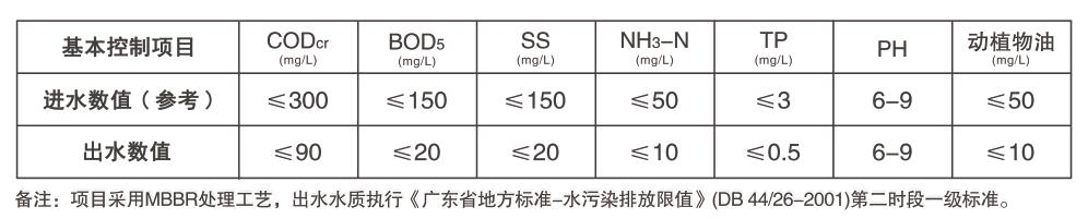 本項(xiàng)目為廣東通驛高速公路服務(wù)區(qū)有限公司惠州市多祝停車區(qū)、加油站一體化污水處理項(xiàng)目,項(xiàng)目采用MBBR處理工藝,出水水質(zhì)執(zhí)行《廣東省地方標(biāo)準(zhǔn)-水污染排放限值》(DB 44/26-2001)第二時(shí)段一級(jí)標(biāo)準(zhǔn)。