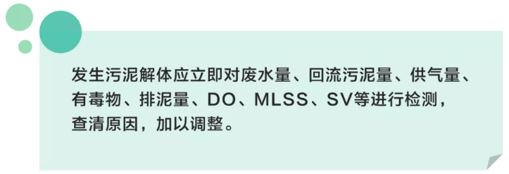 當污泥處理系統(tǒng)出現(xiàn)處理水質(zhì)渾濁、污泥絮凝體細化、處理效果變壞時,即為污泥解體現(xiàn)象。可能是運行不當,曝氣過量,營養(yǎng)平衡遭破壞或是廢水混入有毒物質(zhì)使微生物受到傷害而引起污泥解體。