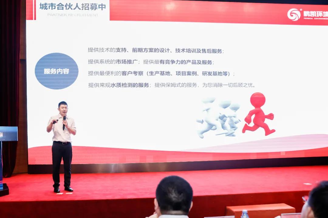 鵬凱環(huán)境王國(guó)彬董事長(zhǎng)以《群雄聚力,共謀發(fā)展》為題發(fā)表演講,詳細(xì)講解了鵬凱環(huán)境城市合伙人的合作模式及服務(wù)內(nèi)容,希望通過(guò)本次會(huì)議,能有更多的優(yōu)秀企業(yè)選擇與鵬凱環(huán)境合作,共創(chuàng)美好未來(lái)。