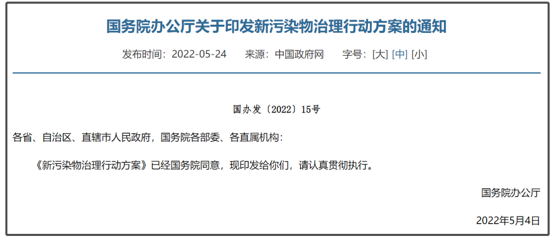 2022年5月,國務院辦公廳印發(fā)《新污染物治理行動方案》,對新污染物治理工作進行全面部署;