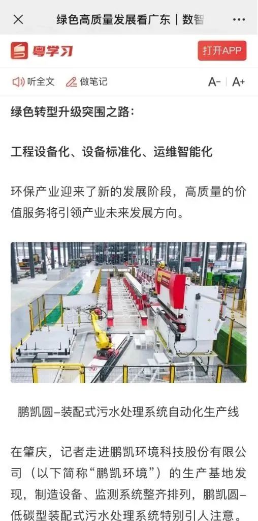 近年來,鵬凱環(huán)境作為裝配式污水廠開創(chuàng)者及水環(huán)境治理綜合服務(wù)商,始終以習(xí)近平新時(shí)代中國特色社會(huì)主義思想為指引,堅(jiān)持走生態(tài)優(yōu)先、綠色發(fā)展之路,把全面深化改革、綠色轉(zhuǎn)型升級(jí)工作不斷向縱深推進(jìn),以“工程設(shè)備化、設(shè)備標(biāo)準(zhǔn)化、運(yùn)維智能化”三化模式驅(qū)動(dòng)技術(shù)產(chǎn)品化、產(chǎn)品工業(yè)化、數(shù)智化轉(zhuǎn)型升級(jí),以科技創(chuàng)新撬動(dòng)生產(chǎn)方式變革、企業(yè)綠色高質(zhì)量發(fā)展,激發(fā)了發(fā)展新動(dòng)能,走出了一條具有鵬凱特色的綠色高質(zhì)量發(fā)展之路。