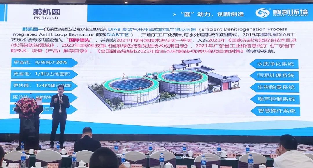 會議上,鵬凱環(huán)境董事長、總經(jīng)理王國彬通過作《低碳型裝配式污水廠探索與實踐》報告,向與會人員詳細講解我司針對傳統(tǒng)污水廠投資高、占地大、工期長、污水管網(wǎng)建設(shè)變更困難等方面痛點難題所研發(fā)的核心產(chǎn)品——鵬凱圓-低碳高效裝配式污水廠。