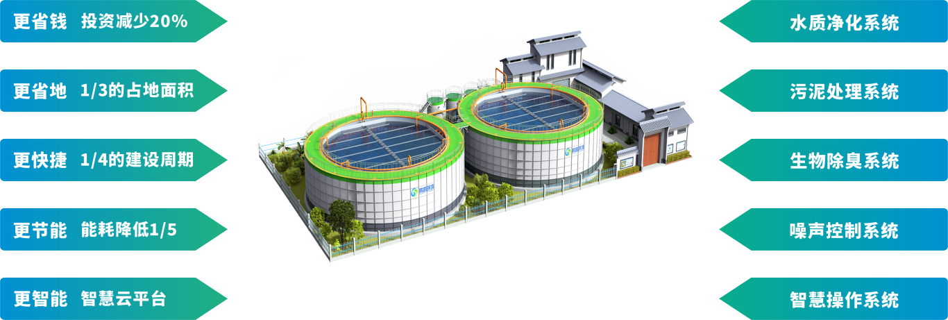 鵬凱圓-低碳高效裝配式污水廠以“工程設(shè)備化、設(shè)備標(biāo)準(zhǔn)化、運(yùn)維智能化”為核心設(shè)計(jì)理念,開啟了工廠化預(yù)制污水處理系統(tǒng)的新模式,較傳統(tǒng)污水廠具有“2345”綜合優(yōu)勢:投資成本減少20%;占地面積僅為傳統(tǒng)污水廠的1/3;建設(shè)時(shí)間僅需傳統(tǒng)污水廠的1/4;能耗降低1/5。